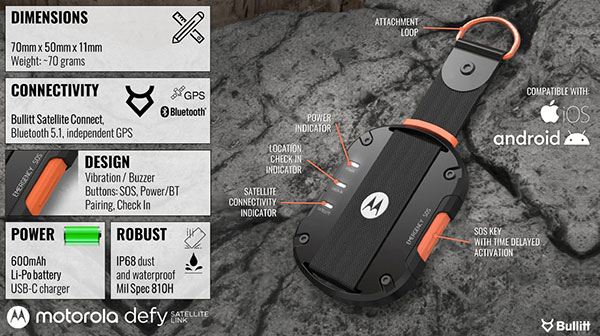 A Motorola Defy Satellite Link valamivel kisebb, mint egy hitelkártya, és a tömege mindössze 70 gramm. Por- és vízálló (IP68), és 600 mAh-s akkumulátora – a gyártó állítása szerint – több napig bírja. Egyszerű segélykérést és helymeghatározást is tud nyújtani egy fizikai bejelentkező gomb segítségével, még akkor is, ha a párosított okostelefon lemerül. Az eszköz az év második negyedében kerül kereskedelmi forgalomba.