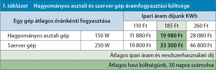 A 3. sz. táblázatban zölddel jelölt adatokból jól látható, hogy milyen költséget jelent nekünk egy átlagos gép áramfogyasztása, magyarországi átlagos ipari árami díjjal kalkulálva2. Az összegek nem tartalmazzák a saját gépünk fenntartásához szükséges egyéb költségeket (ld. 2.sz. táblázat).