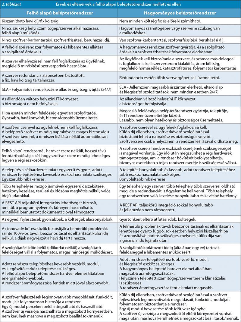1Nem tekinthető felhő alapú működésű beléptetőrendszernek az internetes elérésű online rendszer. A felhő alapú beléptető rendszer célhardvereket használ, a vezérlő közvetlenül csatlakozik a felhőben lévő szerverhez. A cikk a jelenleg elérhető felhő alapú beléptetőrendszer tulajdonságait veti össze az általános beléptetőrendszerrel.