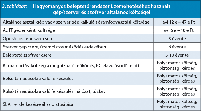 Egy folyamatosan, megbízhatóan működő beléptetőrendszer üzemeltetése sok költségből és komplex megoldások, folyamatok sokaságából épül fel. Aki csak a virtuális szerver havi szolgáltatás díját hasonlítja össze egy saját szerver beszerzési költségeivel, az több fontos szempontot hagy figyelmen kívül (ld. 2. sz. táblázat), rossz döntést hoz, ami pedig hosszú távon gazdasági, biztonságtechnikai és működésbeli hátrányt is okozhat. A költségeket lehet ugyan csökkenteni saját, belső ember alkalmazásával, de egész egyszerűen a fizikai, technológiai korlátok hátrányosan érintik a saját szerverrel üzemeltetett rendszereket, nem is beszélve a redundancia fontosságáról. Egy gép, egy telephely, de a több telephelyes rendszerek nem csak több szerver telepítését és folyamatos üzemeltetését igénylik, sokkal bonyolultabb az adatok, a jogosultságok, és a változtatások menedzselése is.