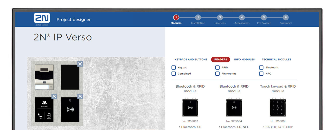 A 2N Project Designerben pár kattintással megadhatja, hogy mit vár el az interkomtól – például telepítés módja, kamera és beléptető modulok terén. Utána kiválaszthatja a legmegfelelőbbet a szűrt találatok közül. Ezt követően licencet és kiegészítőket is adhat a választott intekomhoz. Végül pedig kiválaszthatja a kaputelefonhoz tartozó beltéri és beléptető egységeket. A rendelési számok listáját ezután exportálhatja, amelyet felhasználhat a vásárlása során.