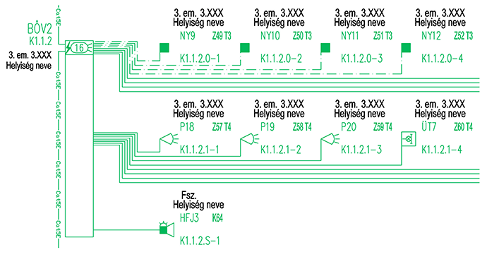 További hasznos funkció, hogy az egyes eszközökhöz az adott helyiségeknek a helyiségpecsétjeit hozzárendelhetjük (helyiség szám, név, méret, illetve emelet), amit akár az elvi rajzon feliratként minden eszköznél feltüntethetünk.